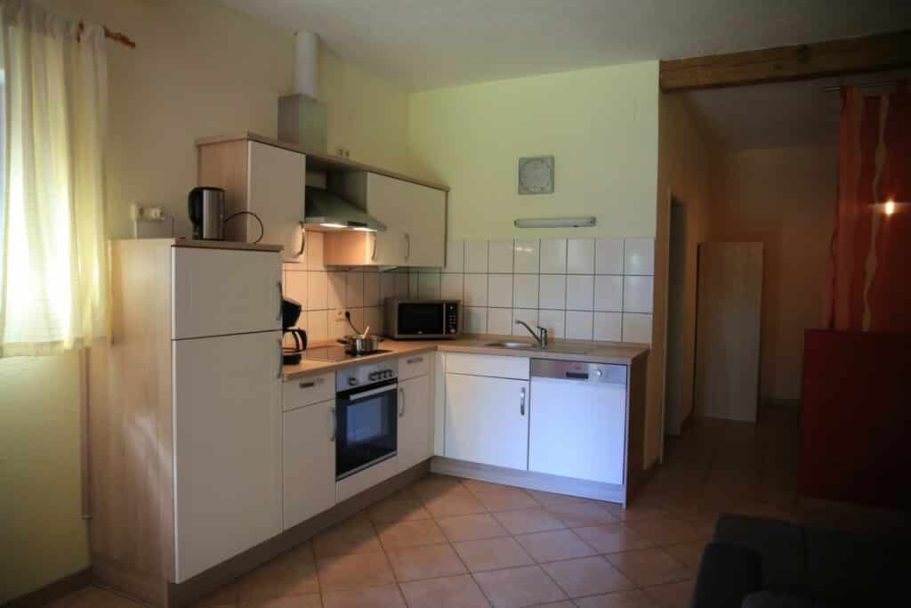 - Küche mit Esstisch, Backofen, Kochfeld, Kühlschrank mit Gefrierfach, Geschirrspüler, Mirkowelle, Wasserkocher, Kaffemaschine, Toaster & Geschirr