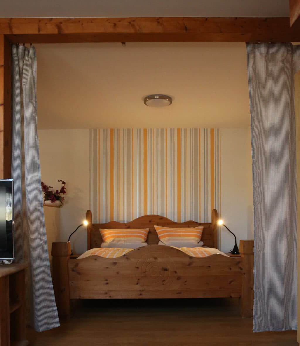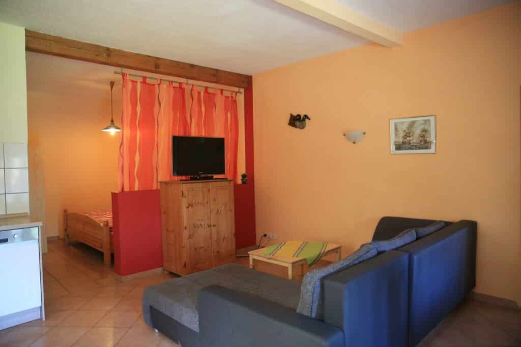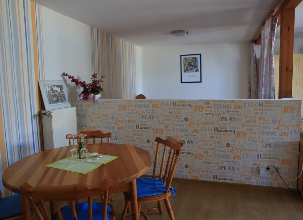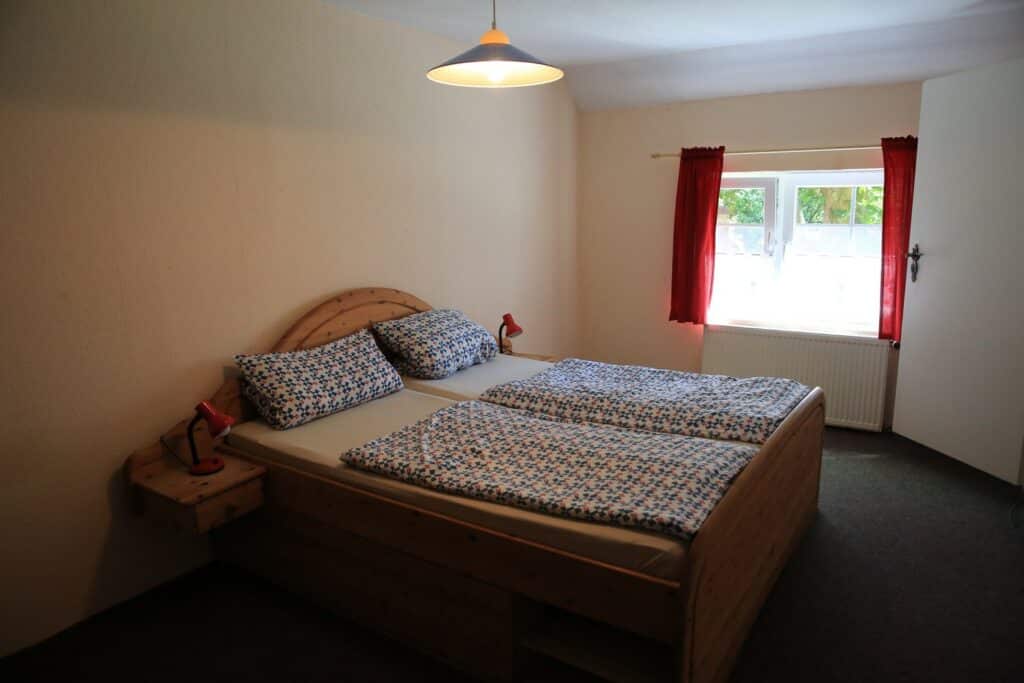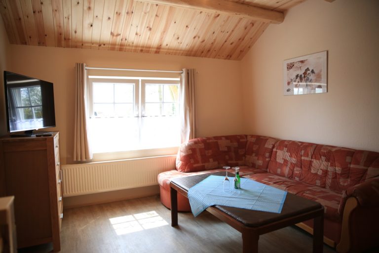 Die Ferienwohnung "Nordblick" liegt in der ersten Etage und besteht aus einem Wohnschlafzimmer mit Doppelbett. Das Schlafzimmer ist durch eine halbhohe Wand getrennt. Das separate Schlafzimmer hat ein Etagenbett und gegebenenfalls ein Zustellbett für die 5 Person.