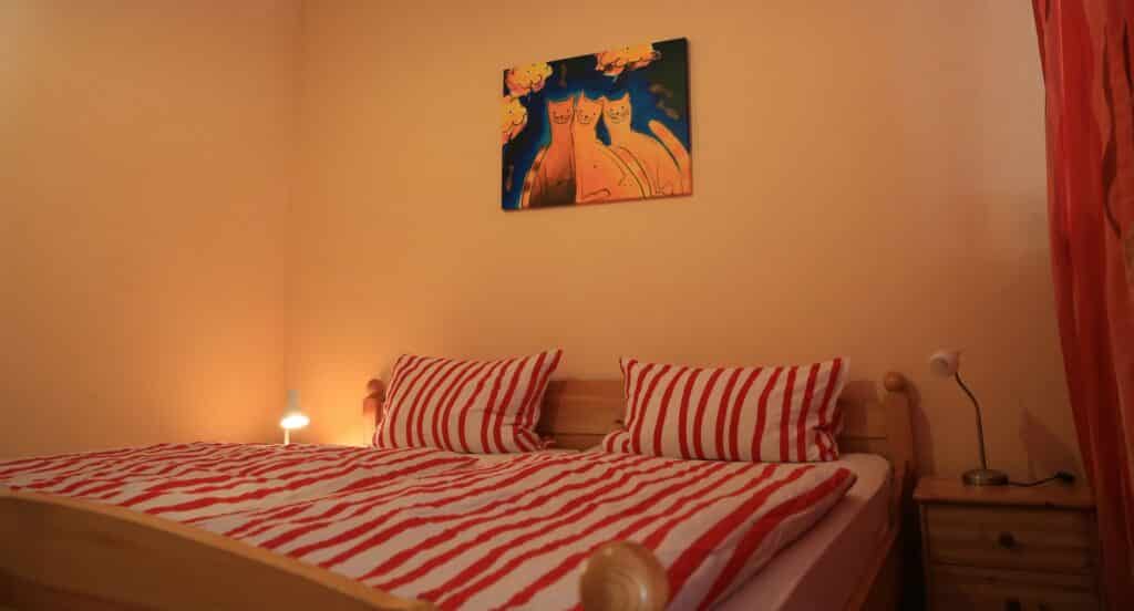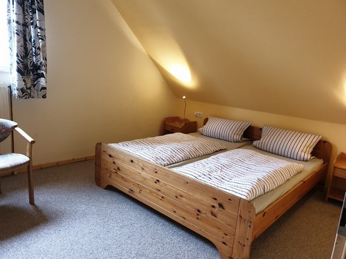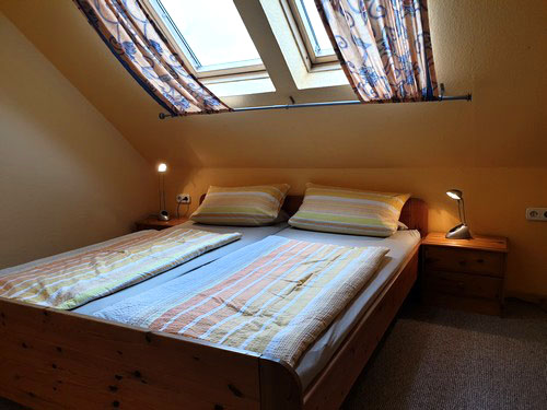 Die Schlafzimmer liegen eine Etage höher. Das große Schlafzimmer mit Ehebett 1,80x2,00m ist ohne Fußteil, so das auch große Gäste darin schlafen können.