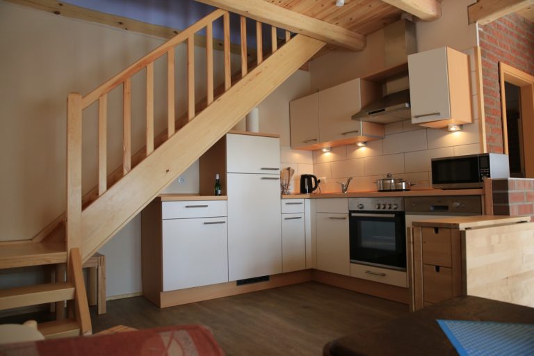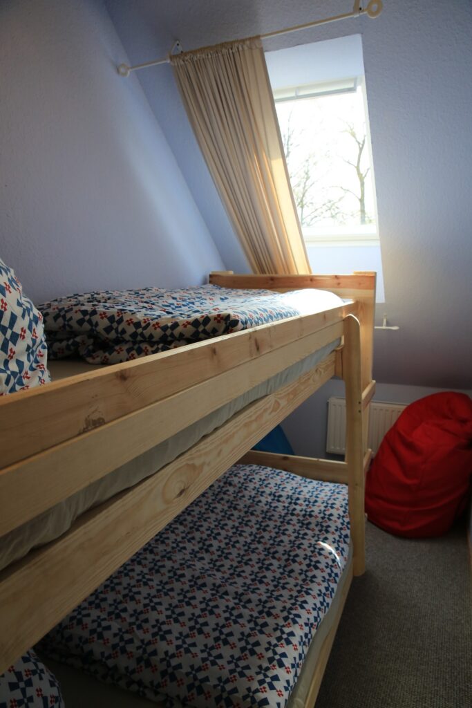 Die Ferienwohnung "Nordliebe"ist im ersten Geschoss und besteht unten aus einem Wohn- & Essbereich sowie dem Badezimmer. Die beiden separaten Schlafzimmer liegen eine Etage höher. Ein Schlafzimmer hat ein Ehebett 1,80x2,00m sowie ein Etagenbett und das zweite Schlafzimmer ein Ehebett 1,80x2,00m.